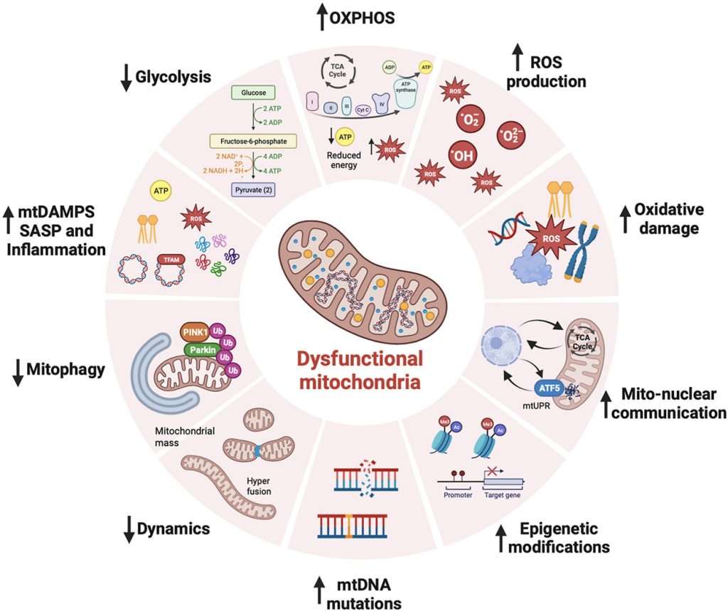 Mitochondria are at the heart of stem cell aging, influencing energy metabolism, oxidative stress, and cellular fate. As mitochondrial dysfunction accumulates with age, stem cells lose their regenerative potential, leading to tissue degeneration and age-related diseases. Cellular senescence is driven by increased ROS production, epigenetic modifications, and impaired mitophagy.