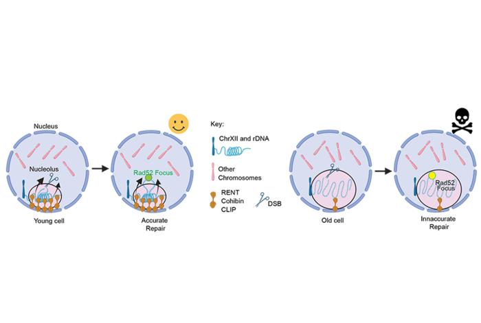 Figure Description: This model of the nucleus with nucleolus (pink) shows how ribosomal DNA is correctly repaired in young cells. In old cells with enlarged nucleolus, however, DNA repair is inaccurate leading to faster cell death.