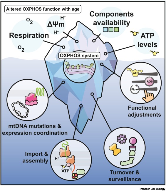 - Proteostasis and quality control mechanisms (e.g., mitochondrial proteases, mitophagy) are essential to maintain OXPHOS integrity and become challenged during aging.